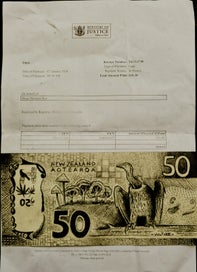 Drawn $50 note used to pay for court fine by Climate Activist Bruce Mahalski+ court receipt + It’s a Climate Emergency T shirt
