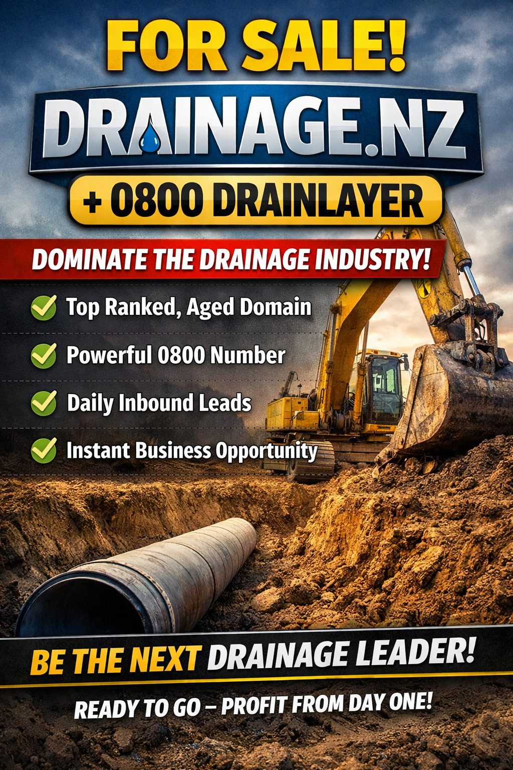 FOR SALE – Premium Drainage Business Website + 0800 DRAINLAYER – site: Drainage.nz