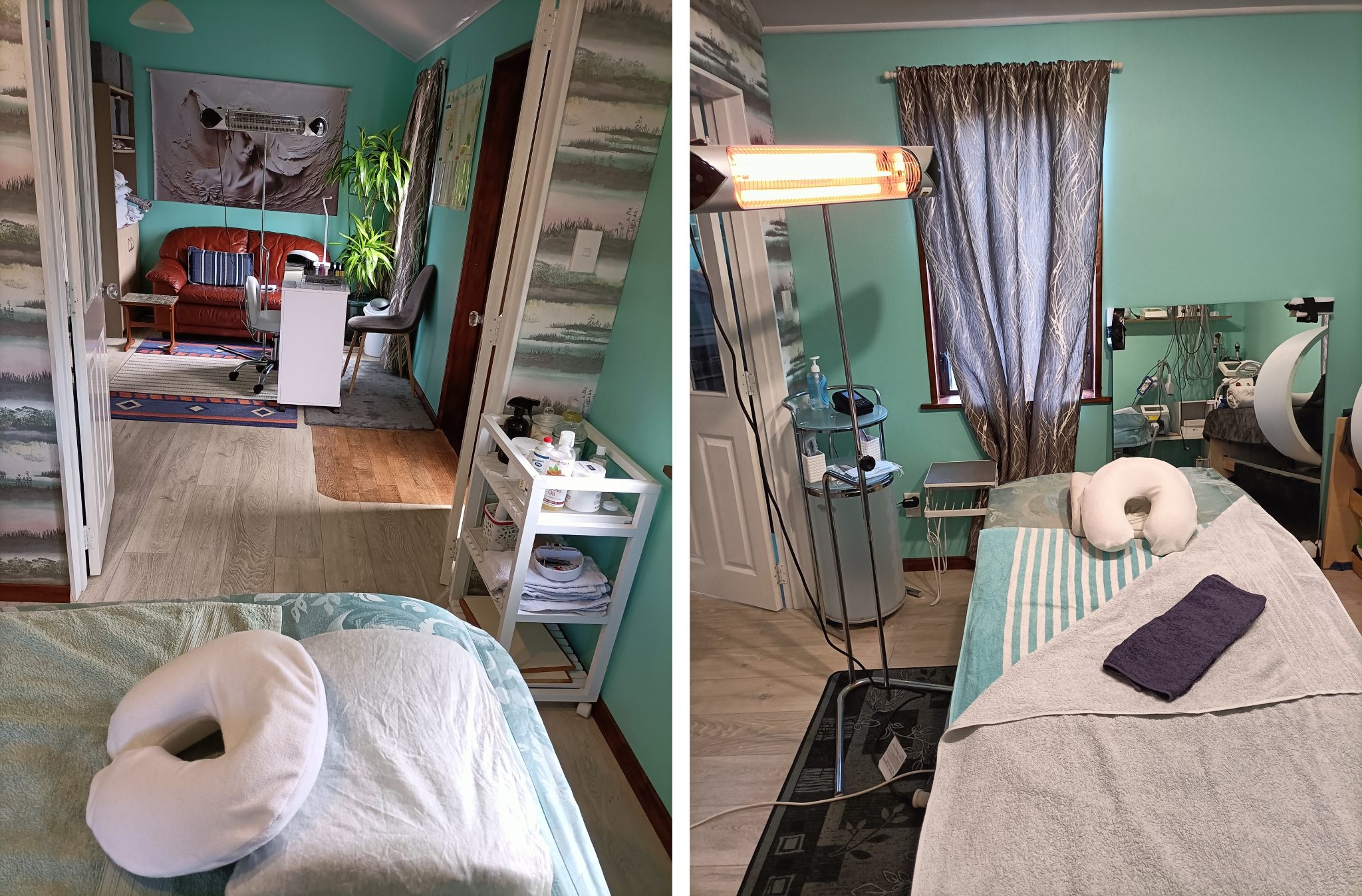 Furniture: Sofa, UV lamp, 2 cabinets for towels & small equipment, 2 display cabinets, various shelves, chairs, tables, mirrors, soft linens, towels & beauty stock.