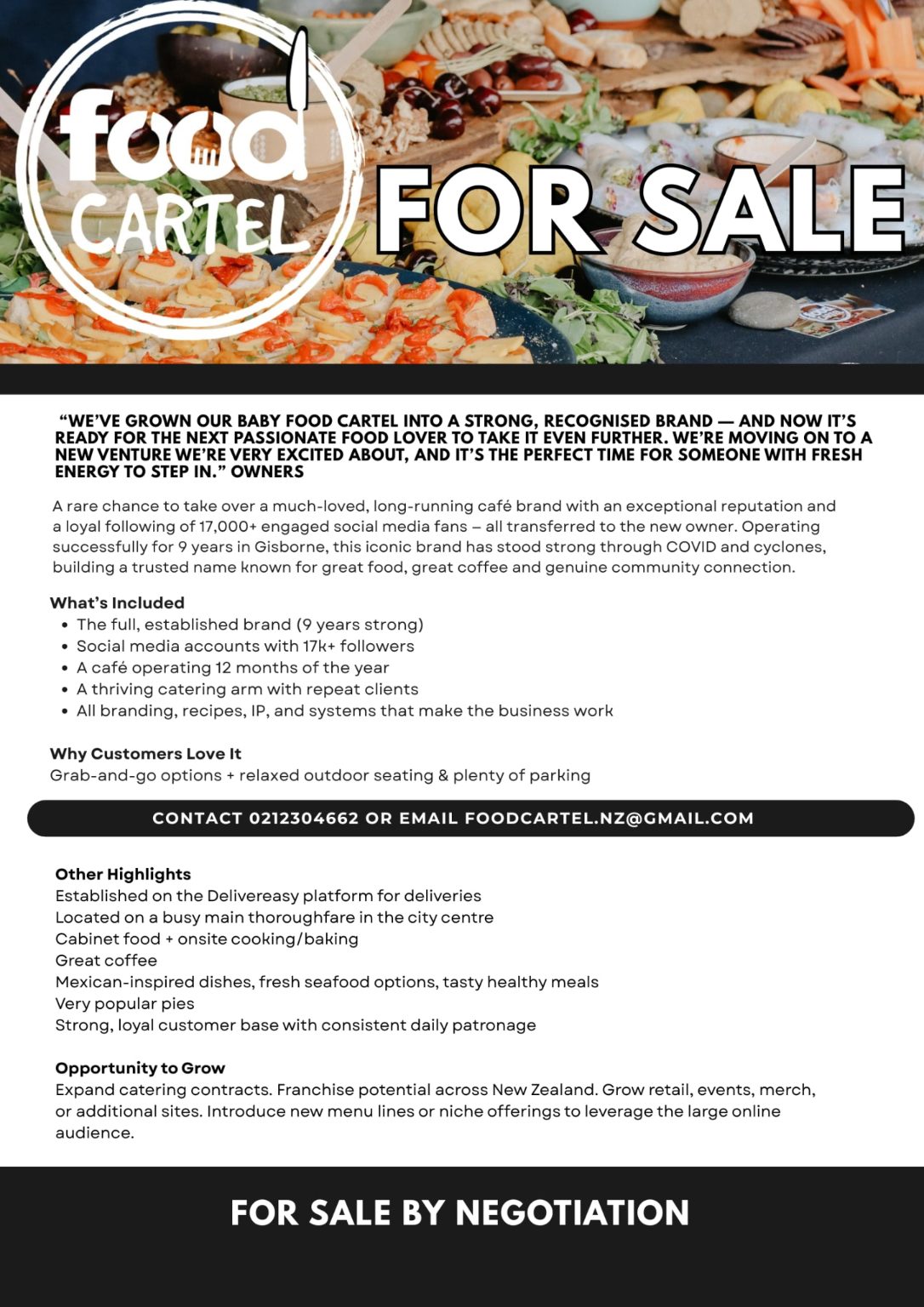 We are established on the @Delivereasy platform for deliveries Located on a busy main thoroughfare in the city center, Cabinet food + onsite cooking/baking Great coffee Mexican-inspired dishes, fresh seafood options, tasty healthy meals Very popular pies Strong, loyal customer base with consistent daily patronage.. Big Opportunity to Grow Expand catering contracts Franchise potential across New Zealand Grow retail, events, merch, or additional sites Introduce new menu lines or niche offerings to leverage the large online audience.. Reason for Sale “We’ve grown our baby Food Cartel into a strong, recognized brand — and now it’s ready for the next passionate food lover to take it even further. We’re moving on to a new venture we’re very excited about, and it’s the perfect time for someone with fresh energy to step in.” For Sale by Negotiation Serious enquiries only. A standout opportunity for an entrepreneur, café operator, or food-lover looking to step into a trusted brand with massive upside. Possible option to lease building and buy chattels only.